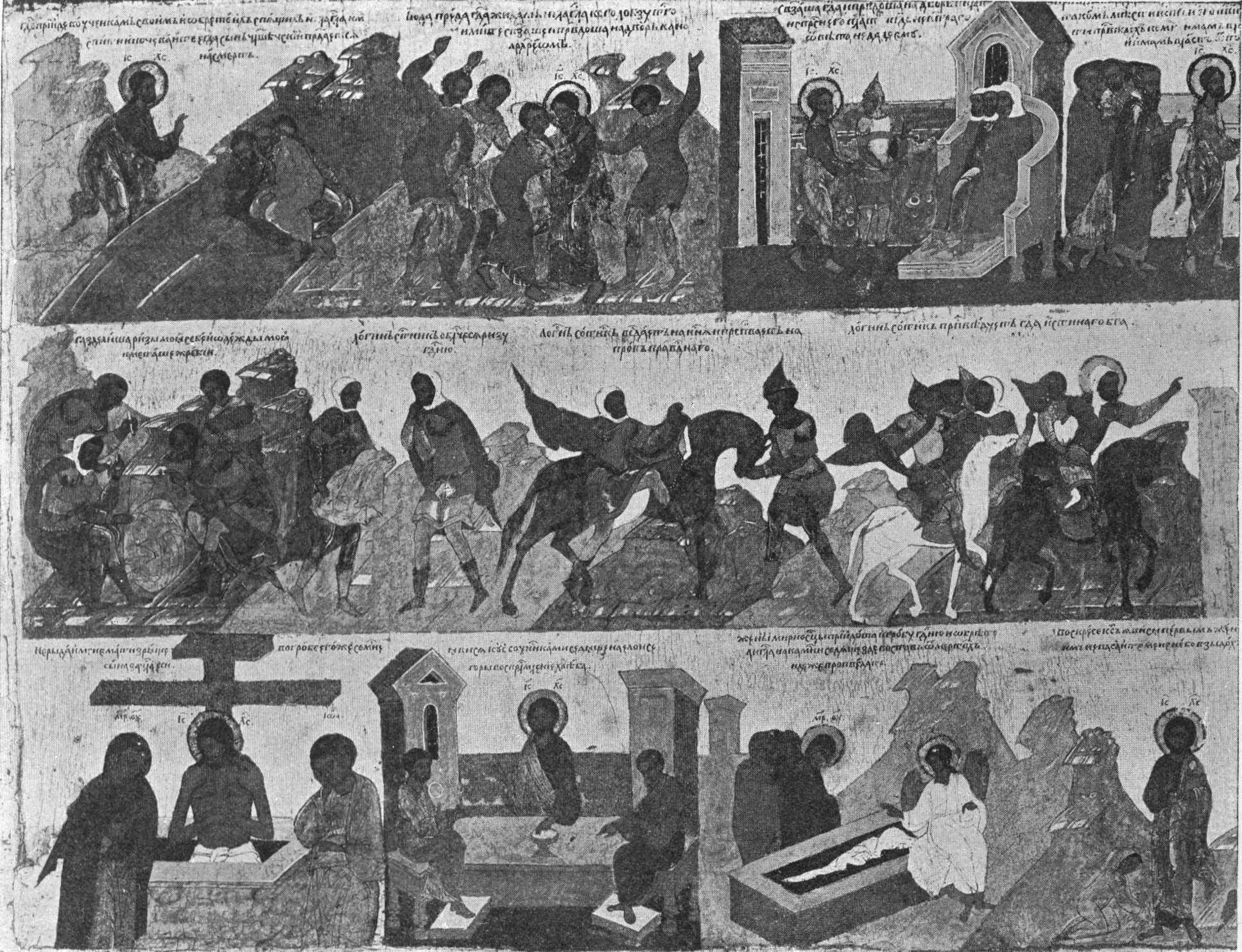 - + История Лонгина Сотника и другие события земной жизни Христа. Часть иконы первой половины 16‑го века. (Музей Александра III в Спб.)
