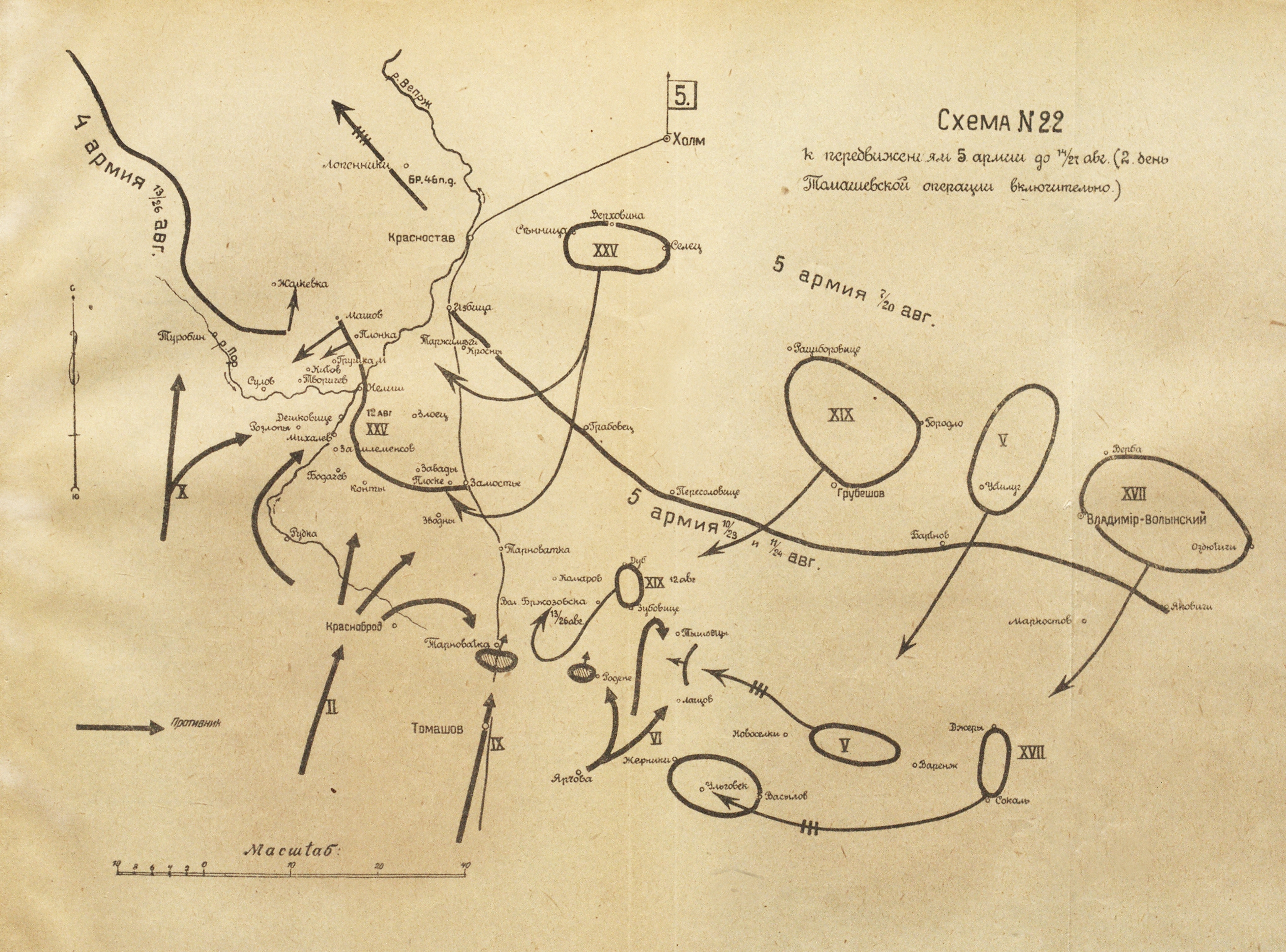 Схема № 22. К передвижениям 5 армии до 14 (27) августа (Второй день Томашевской операции)