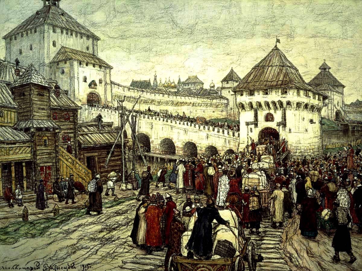 - + 7. В осадное сиденье. Троицкий мост и башня Кутафья. Художник А.М. Васнецов. 1915 г.Страница: 76Номер изображения на странице: 1